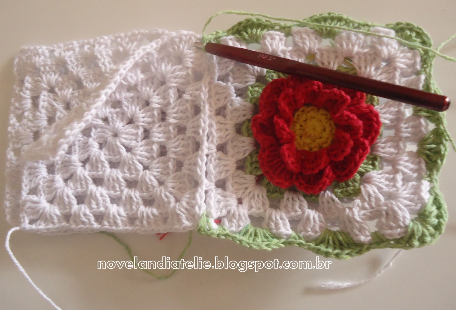 Com o fio branco teça mais duas carreiras, arremate esse square e reserve.