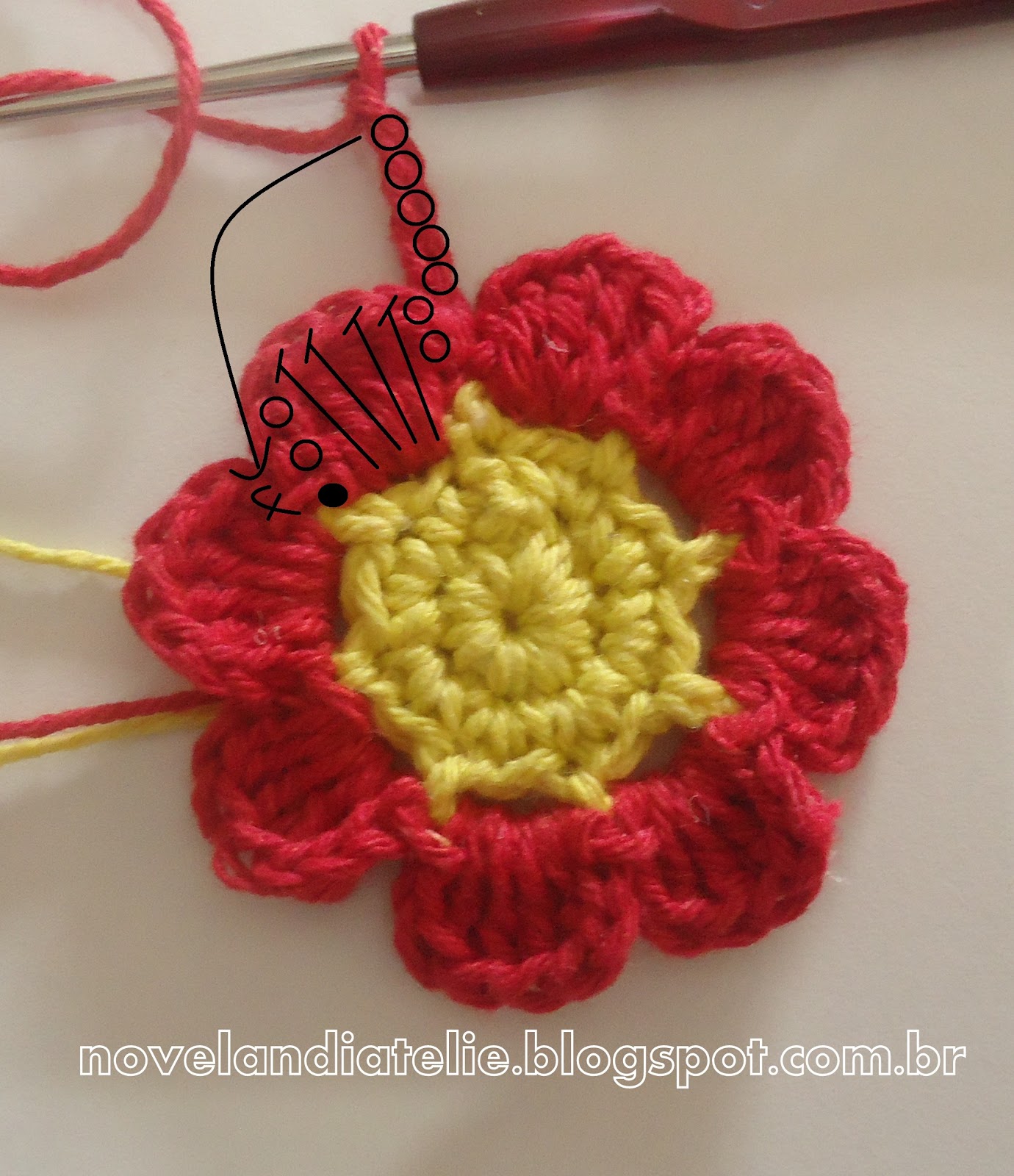 E faça um botão de ponto baixo na ponta: 5 correntes fechadas com um ponto baixíssimo.